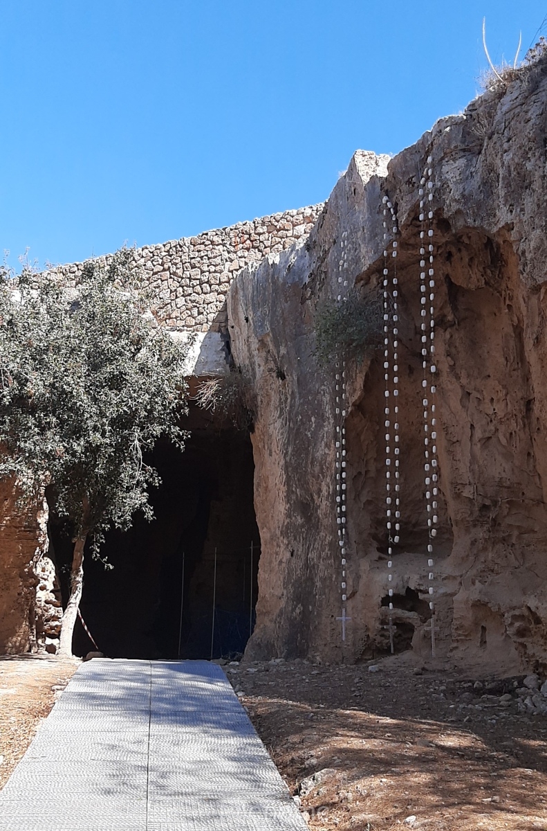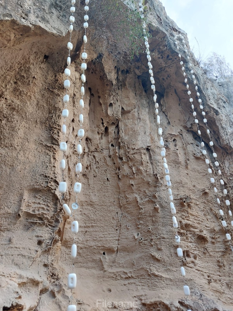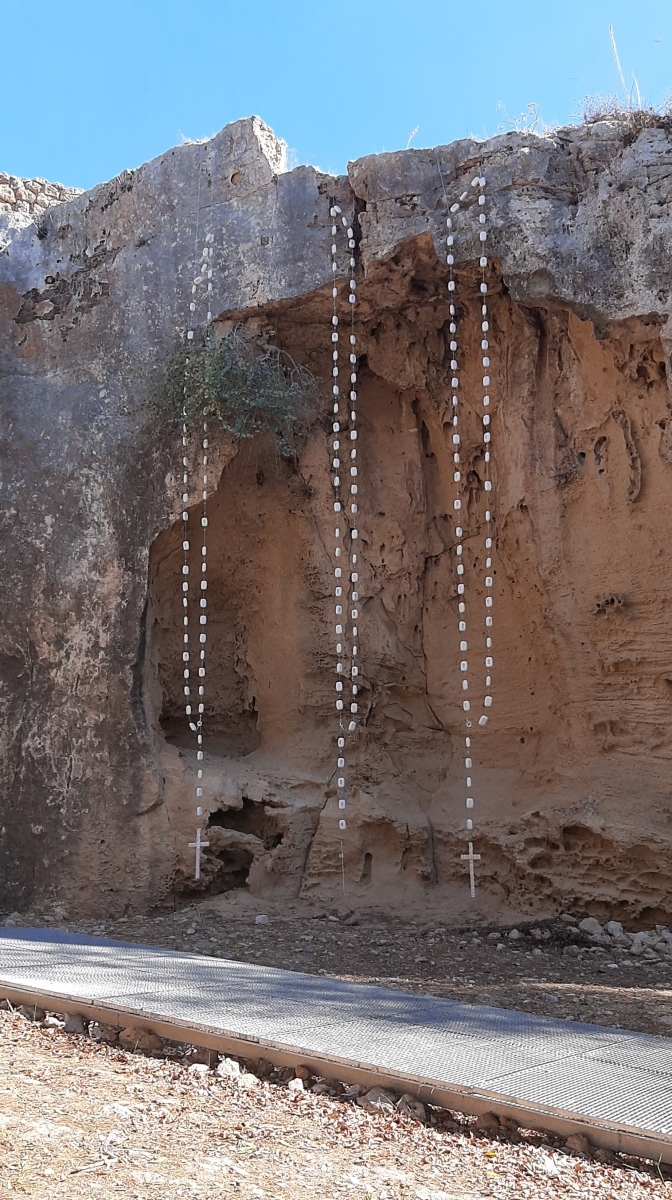 Miriam McConnon’s outdoor installation ‘Holy Trinity’ presents three sets of large rosary beads ( 7 metres high ), each representative of a female figure of religious worship associated with the historical site of Fabrica Hill in Paphos, Cyprus. The three female figures of worship are Aphrodite, Demetra and Holy Mary.